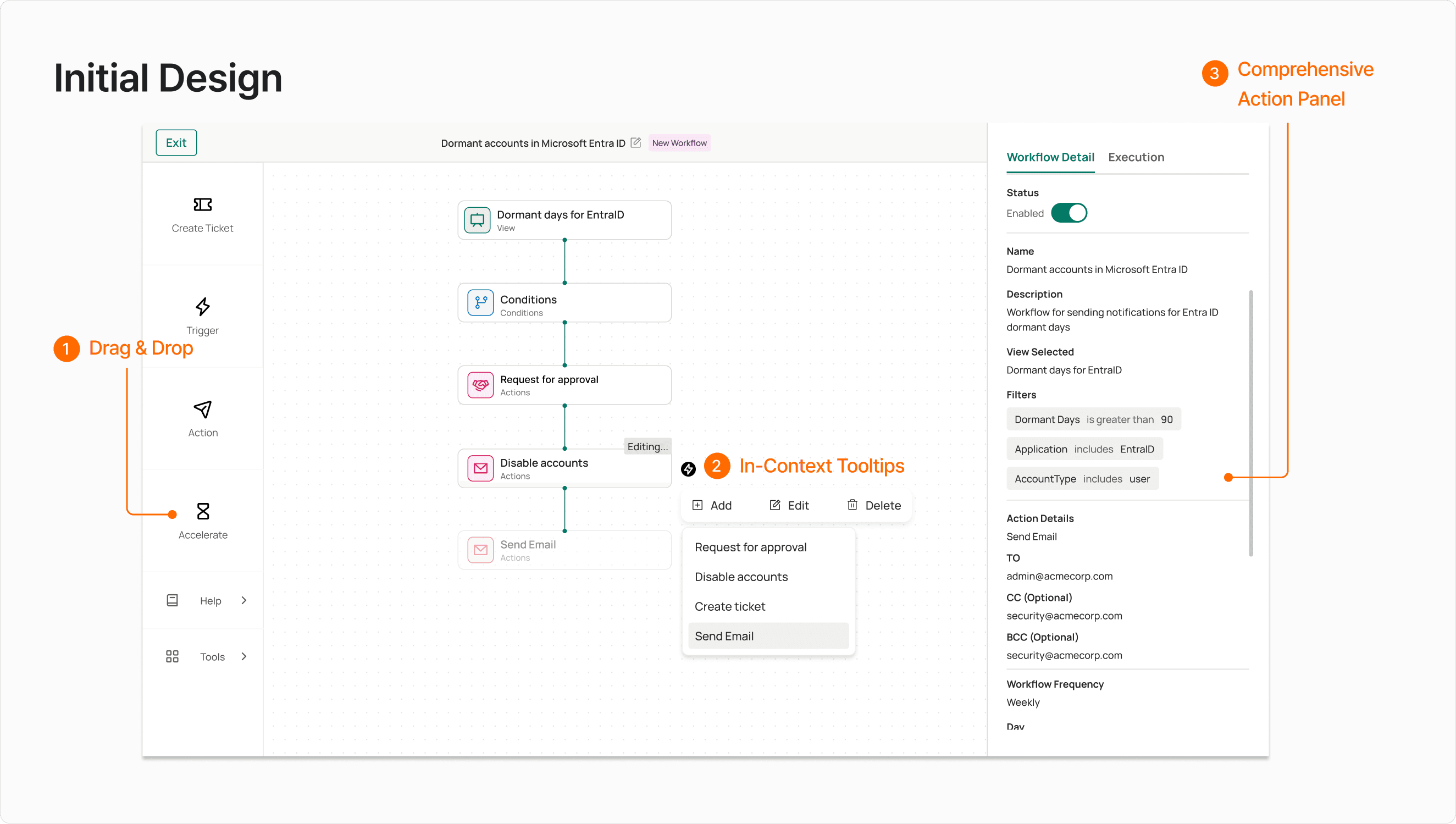 Initially, I gave users full control over the workflow configuration to accommodate diverse admin use cases. I used drag-and-drop to make workflow structure explicit, in-context tooltips to clarify system logic at the point of action, and a comprehensive action panel to expose all available controls, assuming that flexibility and visibility would increase admin confidence.