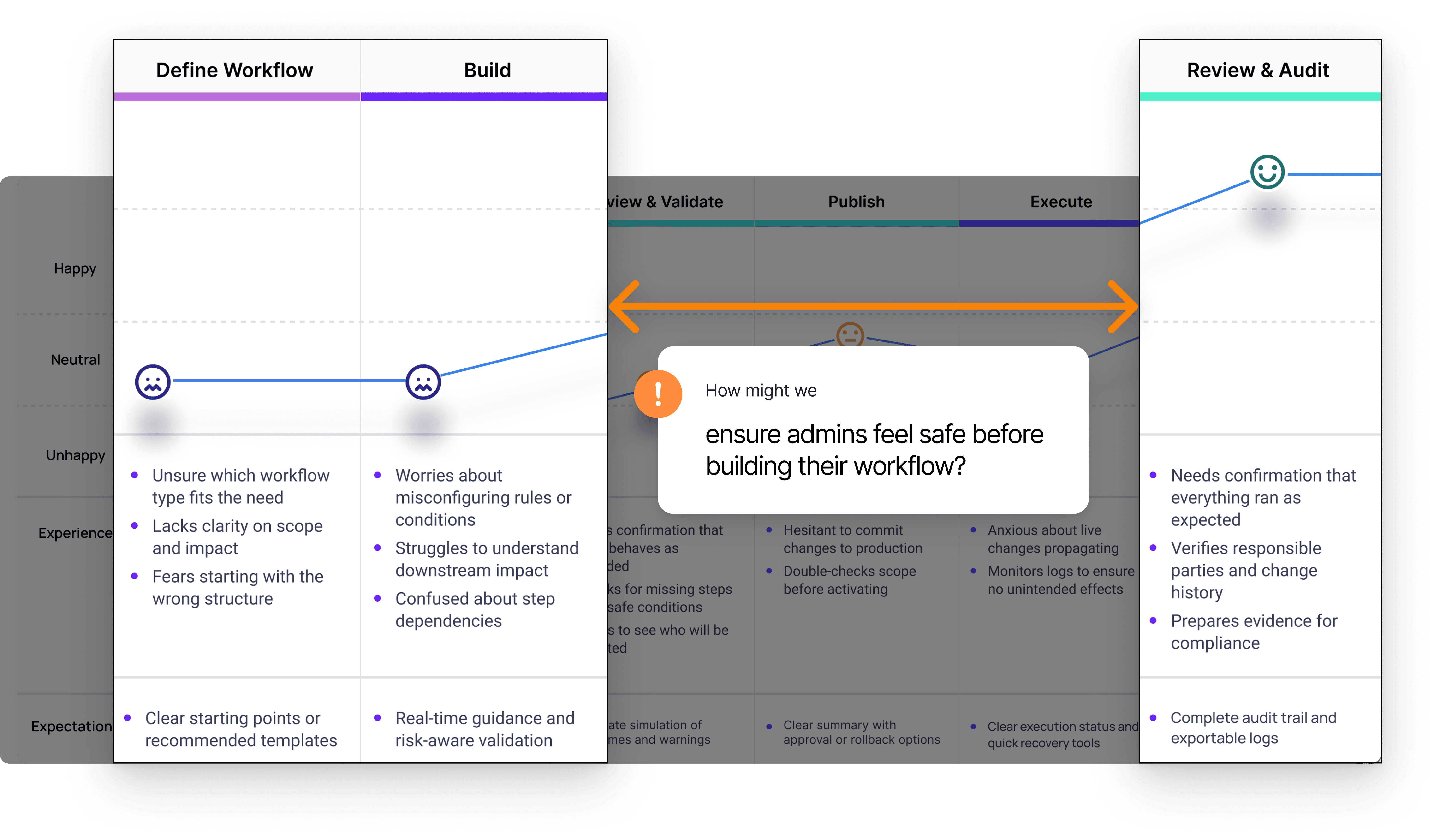 Based on this insight, I shifted the hypothesis from “flexibility first” to “guided decision-making,” and redesigned the workflow around clear paths, safe defaults, and contextual guidance that help admins understand impact before taking action.